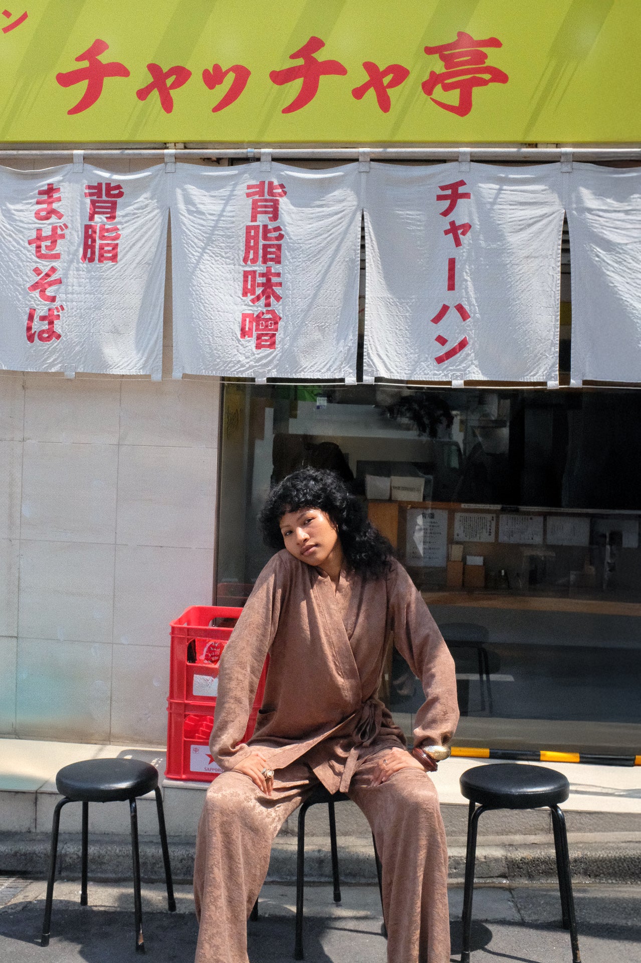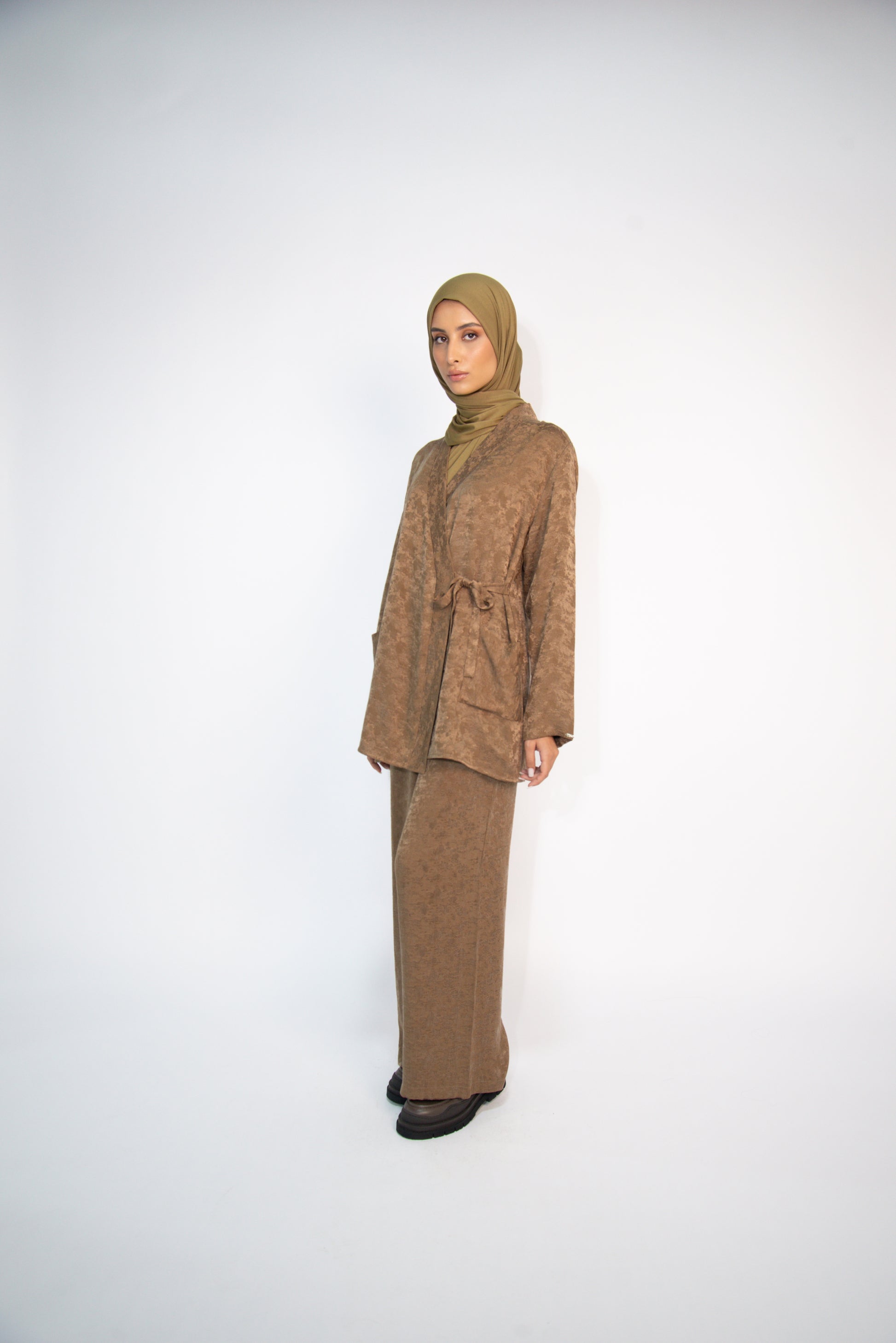 A wrap-style kimono in Cacao powder jacquard, with wide sleeves and rope-tie closure. Oversized yet refined, it blends heritage with modern grace.