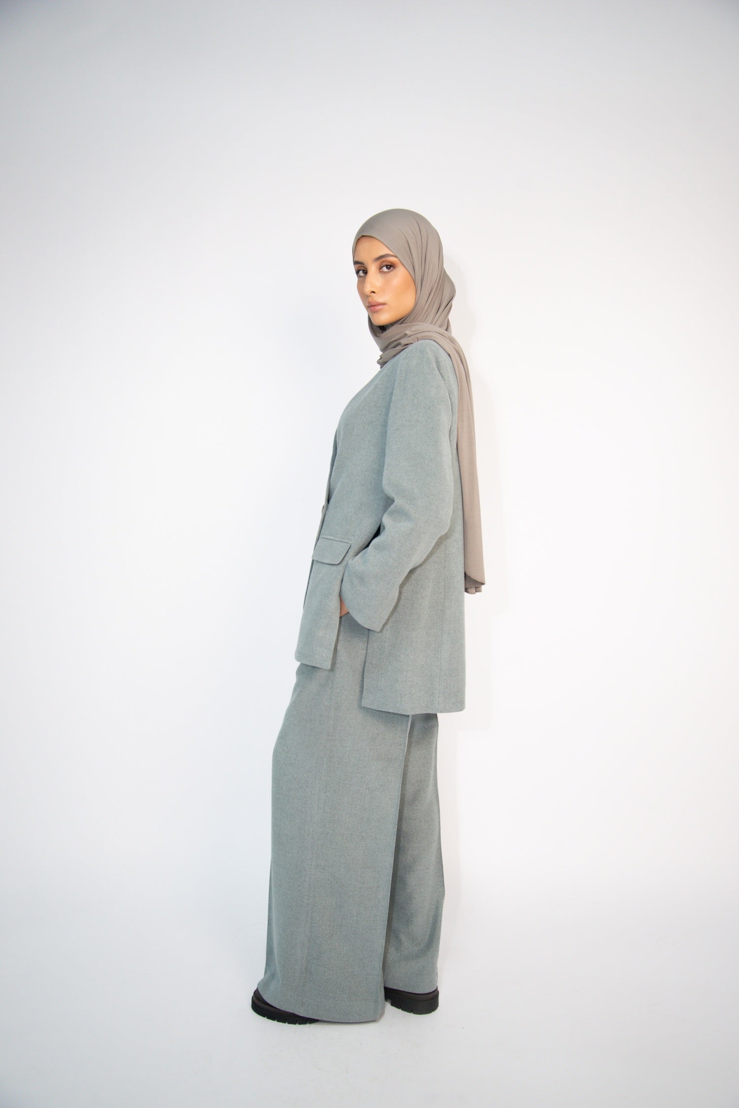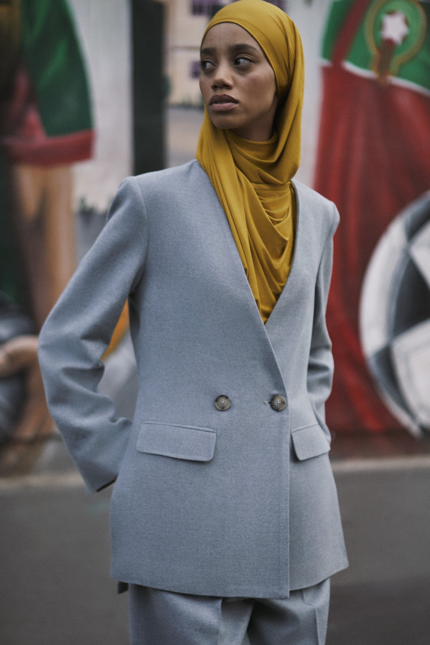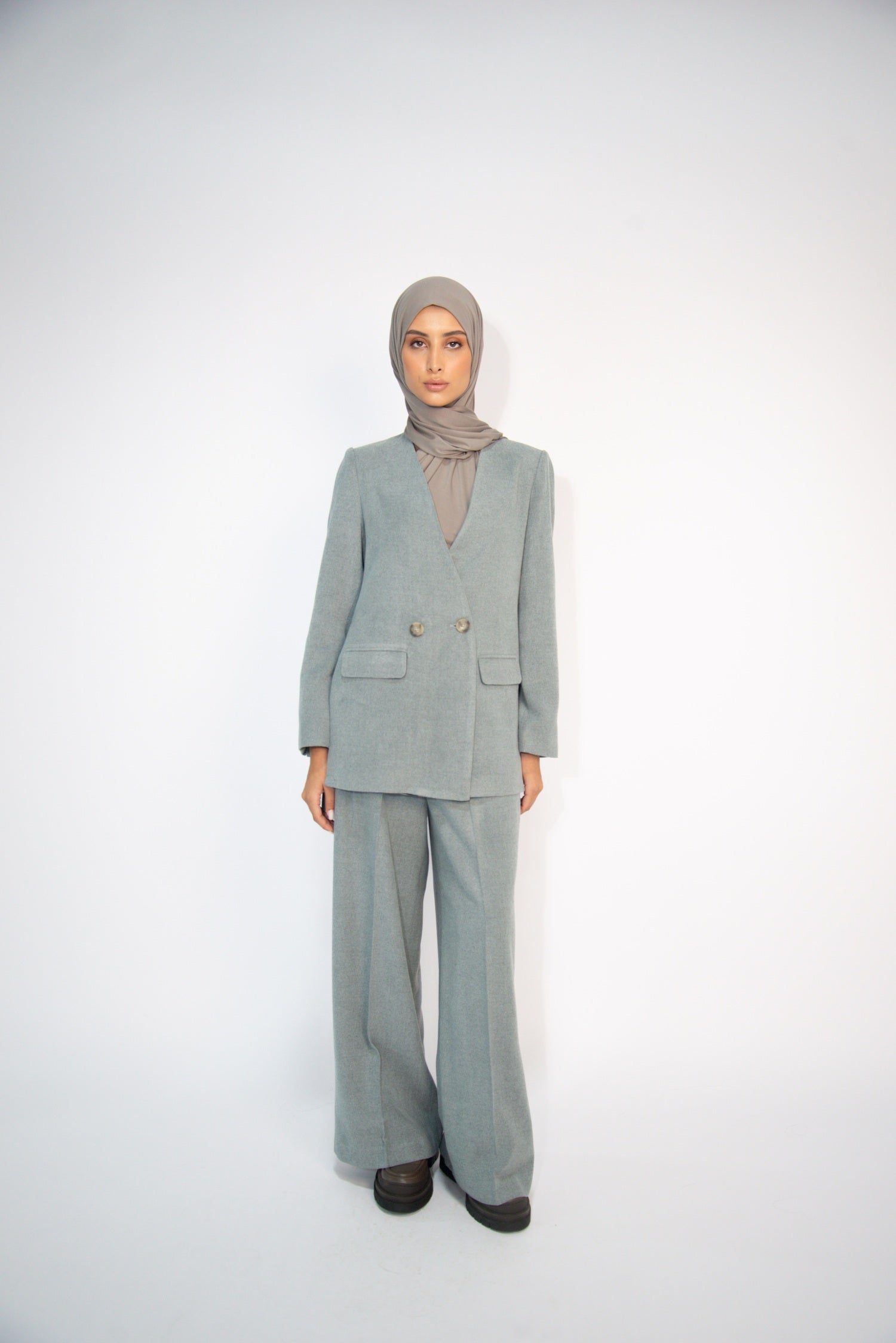 A tailored thigh-length blouze with its V-neckline, front buttons, and side slits, it balances modern minimalism and timeless elegance.