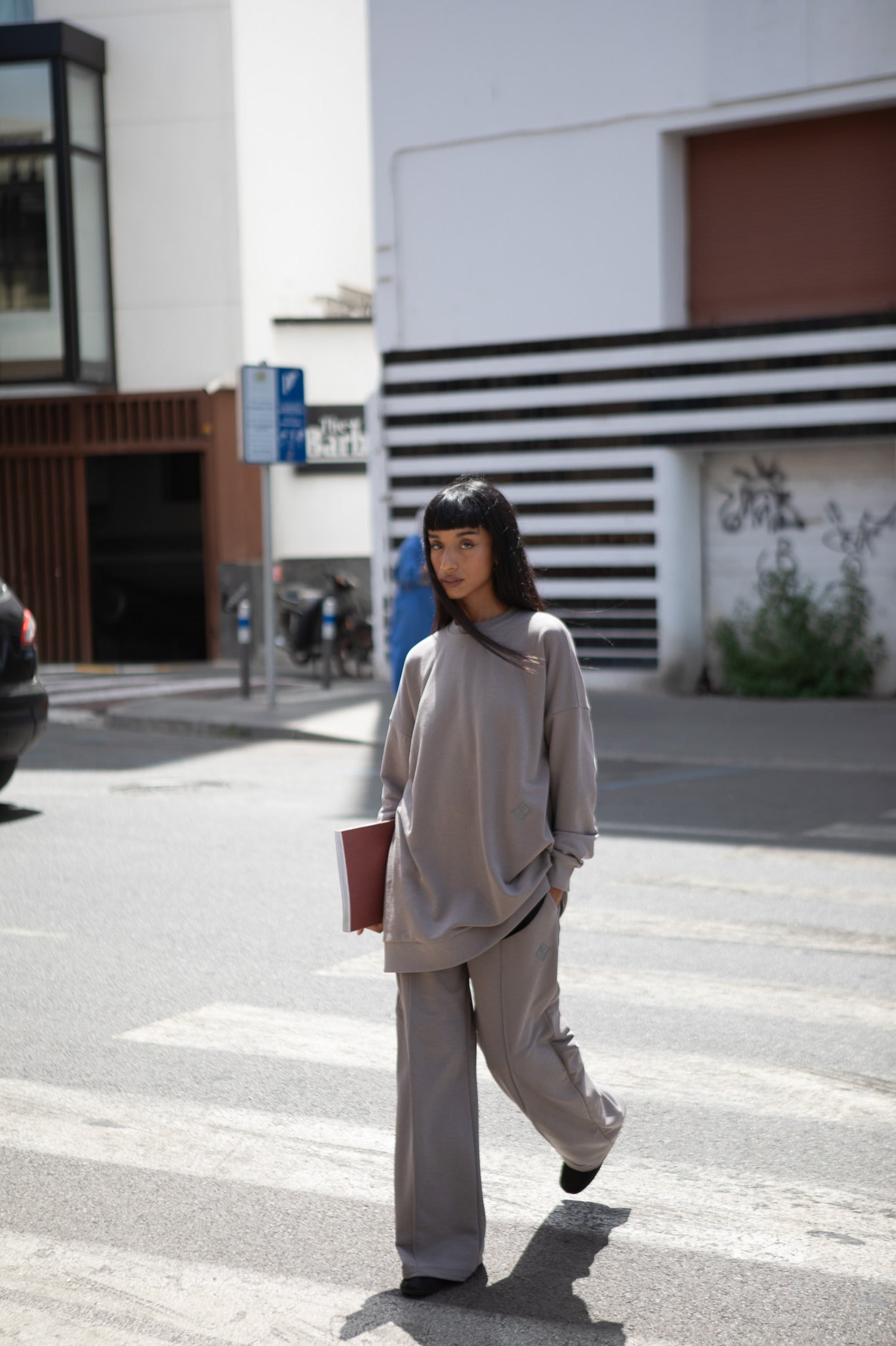 A wide, oversized cotton sweatshirt with a crew neck and ribbed finishes. Relaxed and minimalist, it blends cozy ease with modern sophistication. Available in Dark Grey and Ash Taupe.