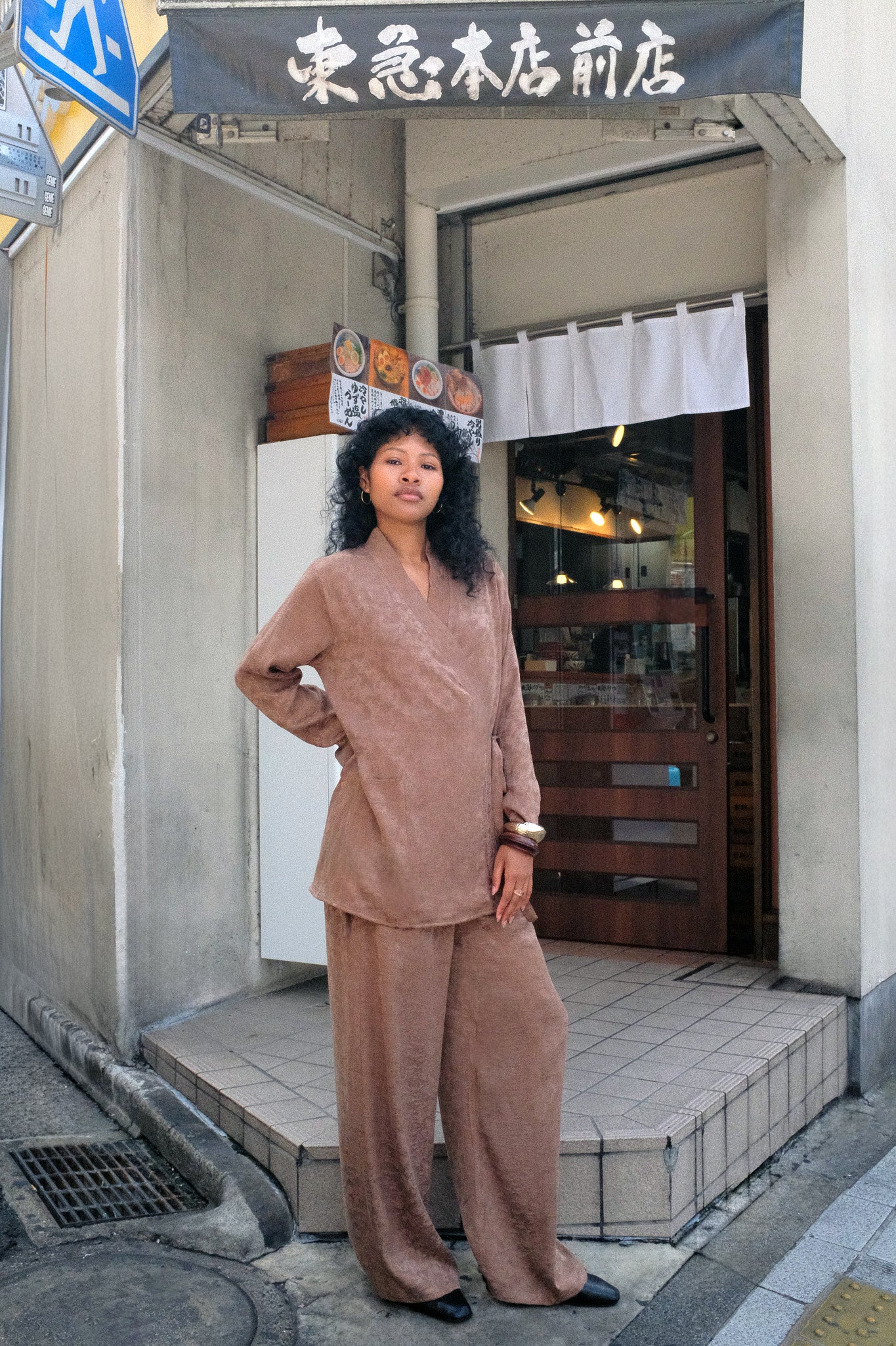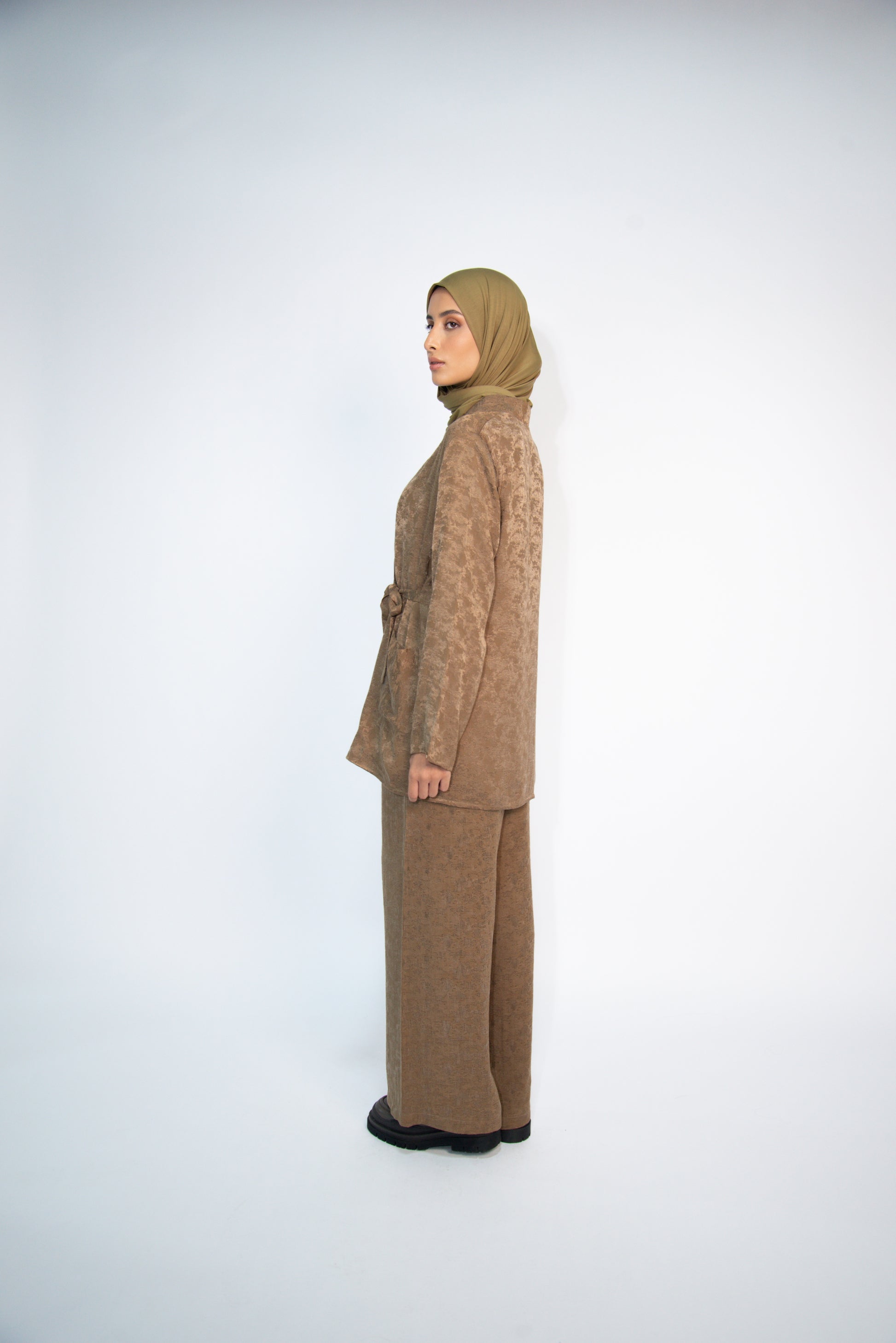 Wide-leg pants in soft Cacao powder jacquard, designed for ease and movement. A versatile staple that grounds the Emi Blouse with quiet elegance.